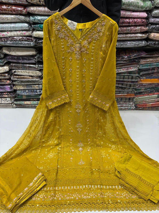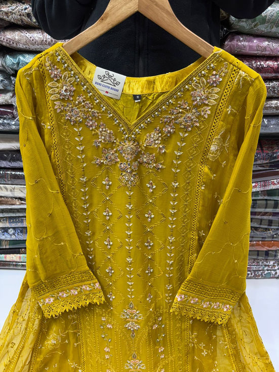 PURE CHIFFON NECK HAND WORK GOWN SHIRT.
